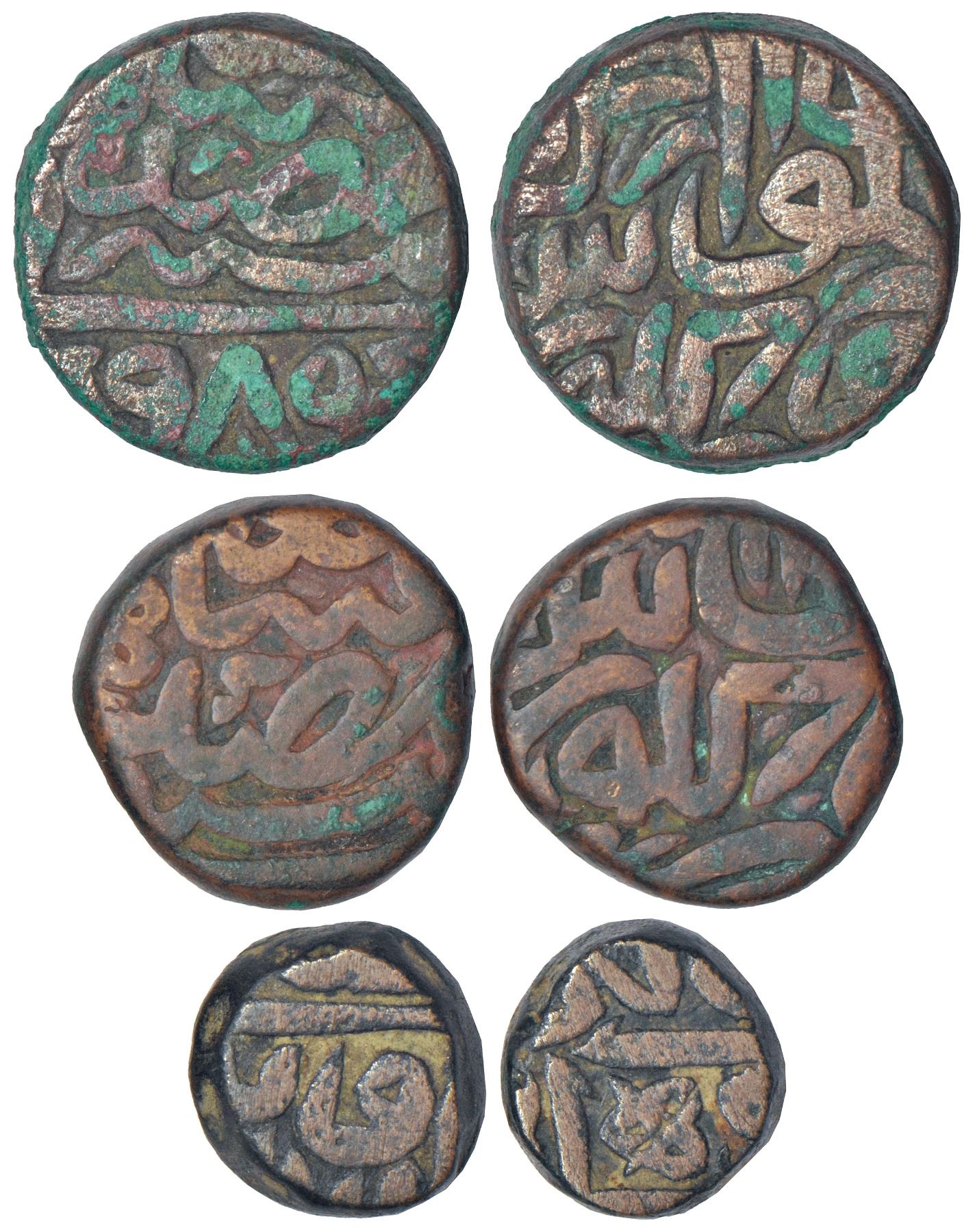 Akbar (1556-1605 AD) - three copper coins of Dar al-Khilafah Gorakhpur mint: Dam (AH984, 20.10g), ½ Dam (Ah982, 9.83g) and ¼ Dam (underweight, 3.97g); the last of an earlier type with 'Nasir al-Din' legend. (3 coins)