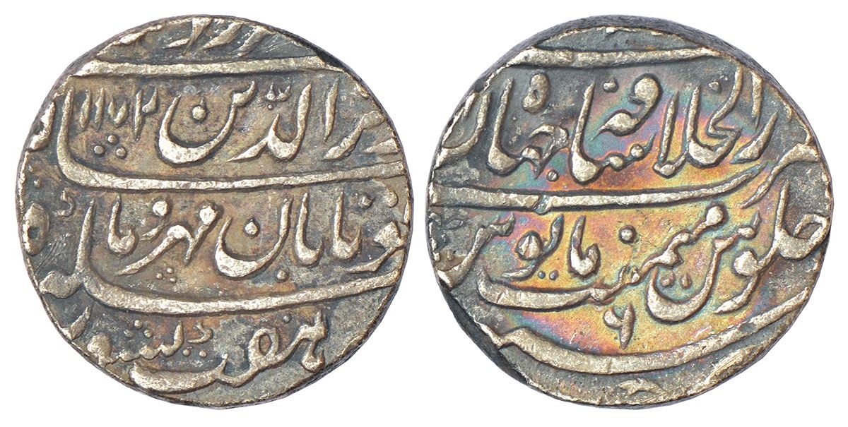 Alamgir II (1754-1759 AD), silver rupee, Dar ul-Khilafat Shahjahanabad mint, 'Aziz ud-Din Alamgir' type, 'Taban’ couplet, AH 1172/RY 6, KM 457.1, 11.23g.