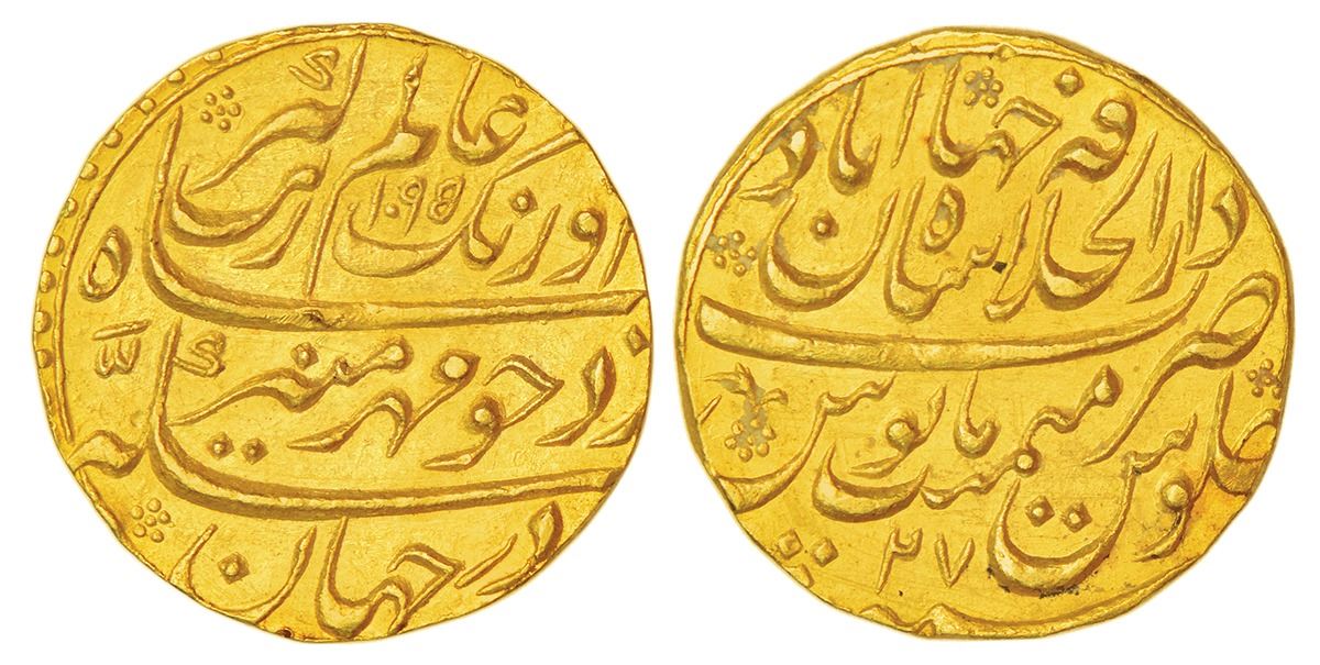 Aurangzeb (1658-1707 AD), gold mohur, Dar ul-khilafat Shahjahanabad mint (fully visible), 'Mihr-e-munir' couplet, AH 1095/RY 27, KM 315.42, 23.90mm, 10.90g. Obv: Persian legend sikka zad dar jahan chu mehre munir shah aurangzeb Alamgir with AH date. Rev: Mint-name with epithet, RY and Jalus formula.