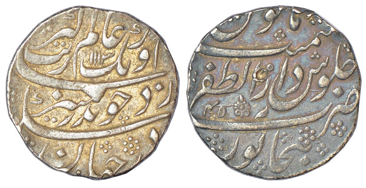 Aurangzeb (1658-1707 AD), silver rupee, Dar uz-Zafar Bijapur mint, 'Badar-e-munir' couplet, AH 1113/RY 45, vithoba symbol on reverse, KM 300.23, 11.40g.