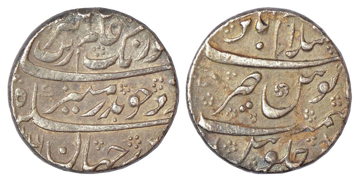 Aurangzeb (1658-1707 AD), silver rupee, Islamabad mint at top, 'Badar-e-munir' couplet, AH 1076/RY 7, KM 300.35, 11.34g.