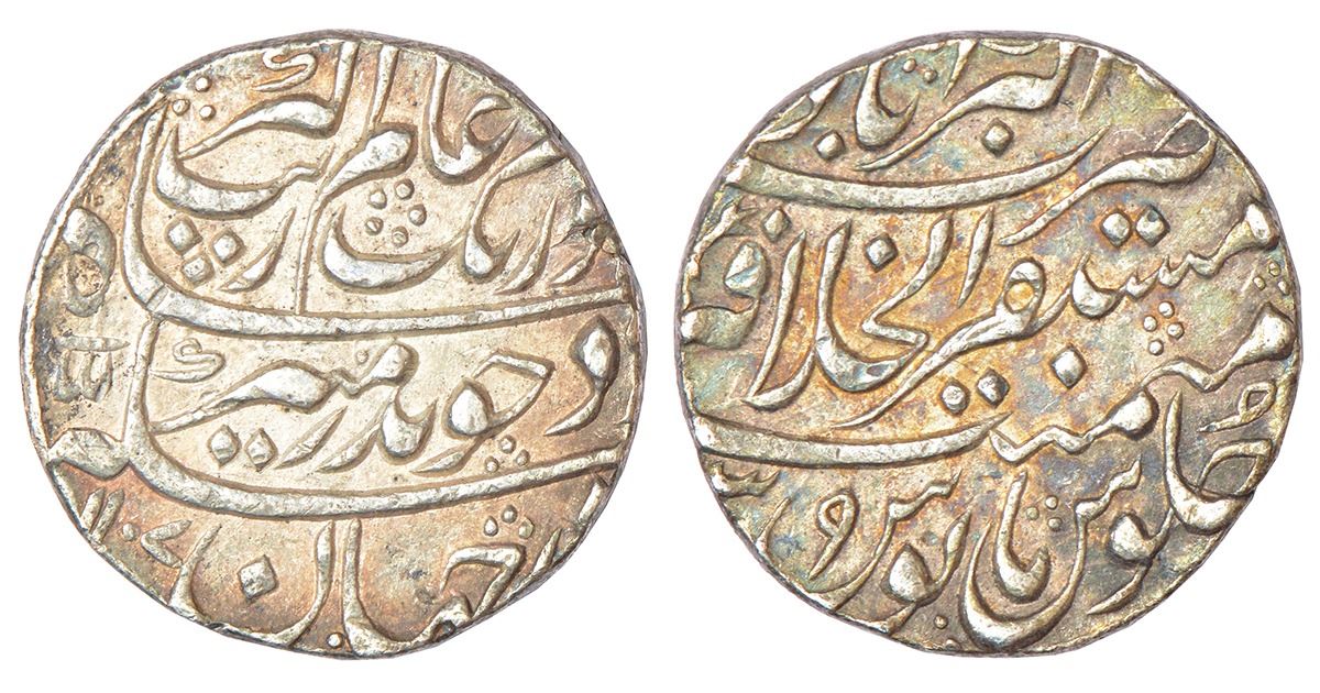 Aurangzeb (1658-1707 AD), silver rupee, Mustaqir ul-Khilafat Akbarabad mint at top, 'Badar-e-munir' couplet, AH 1107/RY 39, KM 300.6, 11.38g.
