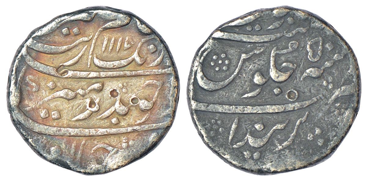 Aurangzeb (1658-1707 AD), silver rupee, Parenda mint (fully visible), 'Badar-e-munir' couplet, AH 1117/RY 50, struck during the last year of the emperor, KM 300.70, 11.37g.