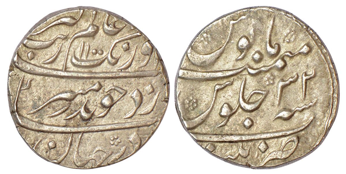 Aurangzeb (1658-1707 AD), silver rupee, Patna mint at bottom, 'Badar-e-munir' couplet, AH 1100/RY 32, KM 300.71, 11.54g.