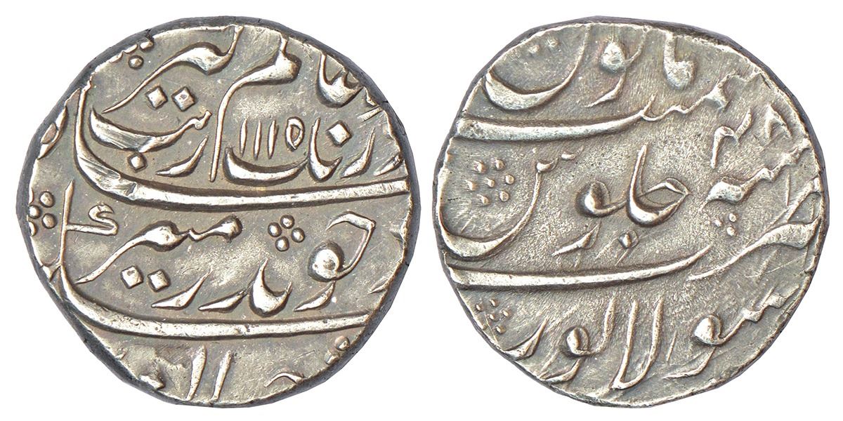 Aurangzeb (1658-1707 AD), silver rupee, Sholapur mint (fully visible), 'Badar-e-munir' couplet, AH 1115/RY 48, KM 300.82, 11.48g.