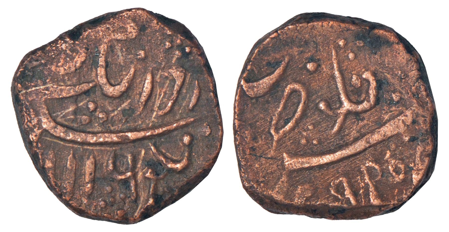 Aurangzeb (1658-1707 AD), copper ½ dam struck to light weight standard, Nusratgarh mint, AH 1116, crude style appropriate for South Indian Mughal issues, 6.59g. Obv: Farsi legend Fulus Aurang(zeb) Shahi with AH date. Rev: Mintname and the word 'Julus'.