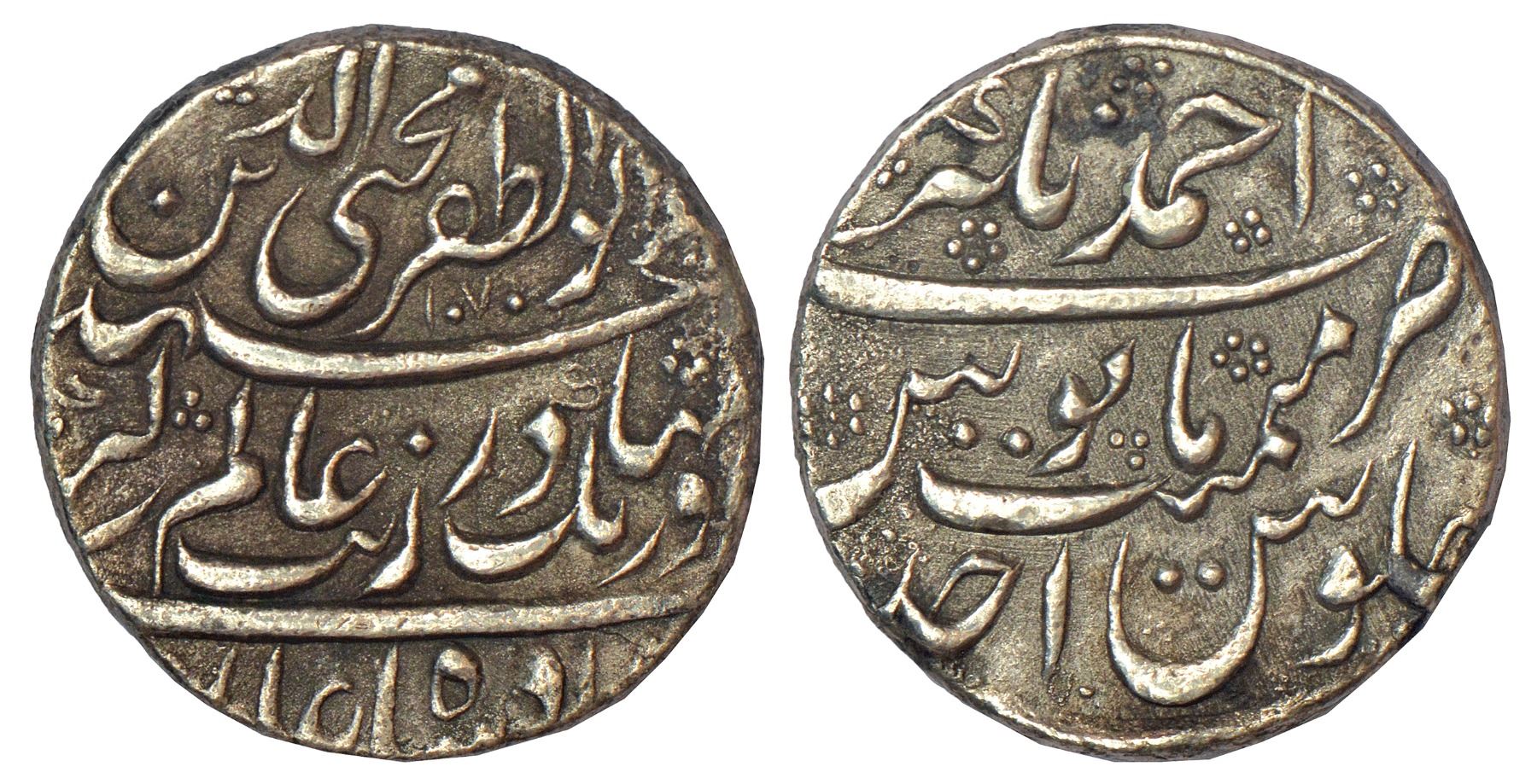 Aurangzeb (1658-1707 AD), silver rupee, Ahmadnagar mint at top (fully visible), AH 1070/RY Ahd, with Emperor's full name Muhiy ud-Din Muhammad Aurangzeb Alamgir , KM 297.1, 11.40g.
