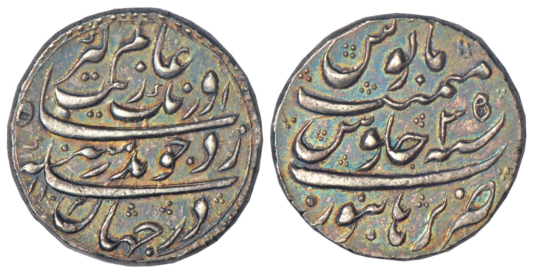 Aurangzeb (1658-1707 AD), silver rupee, Burhanpur mint (fully visible), AH 1103/RY 35, KM 300.24, 11.50g. Toned,