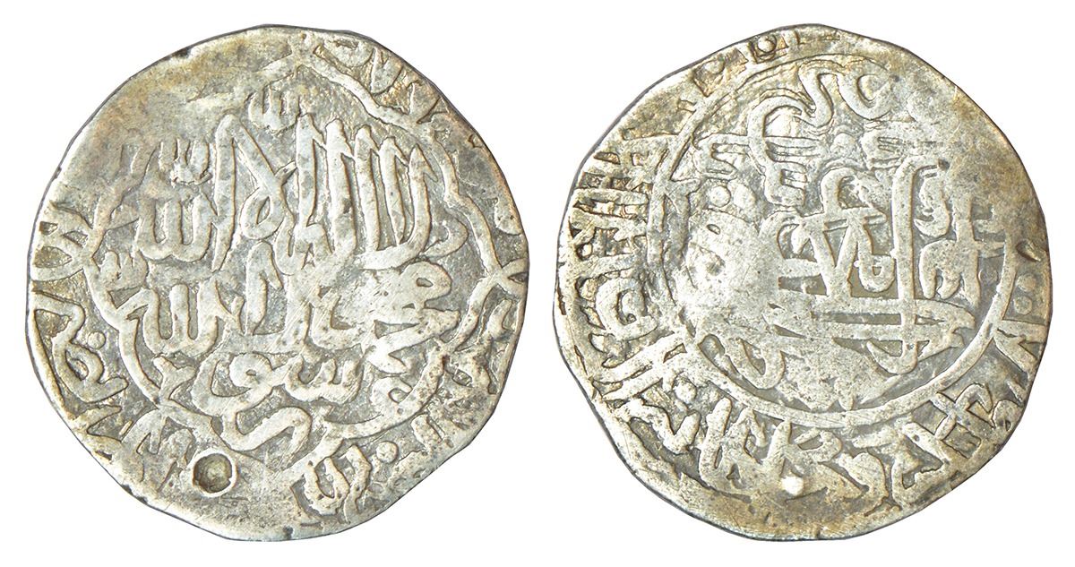 Mughals: Babur (1526-1530 AD) - silver shahrukhi of mintless and dateless type, Rahman 70-03, 4.54g. Obv: Shahada within four -lobed mihrabi border, names of four Caliphs and their titles around. Rev: Arabic legend Zahir ud-din Muhammad Babur Badshah Ghazi in scalloped circle, other titles in margins.