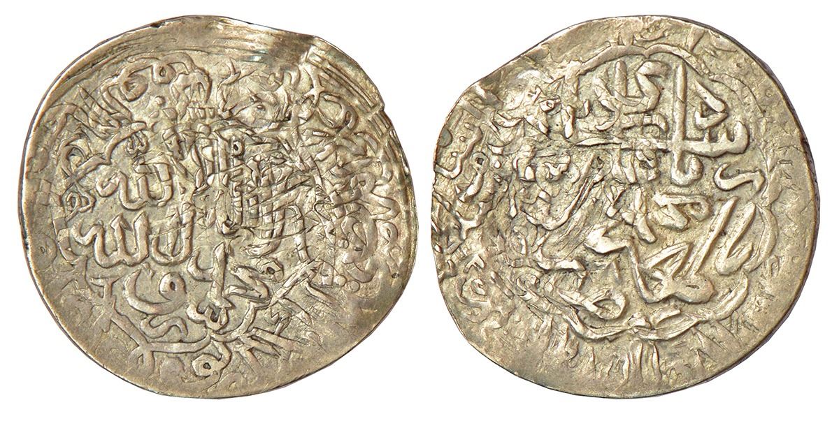 Mughals: Babur (1526-1530 AD) - silver shahrukhi of mintless and dateless type, severe die slippage on both sides, Rahman 70-03, 4.66g. Obv: Shahada within four-lobed mihrabi border, names of four Caliphs and their titles around. Rev: Arabic legend Zahir ud-din Muhammad Babur Badshah Ghazi in scalloped circle, other titles in margins.