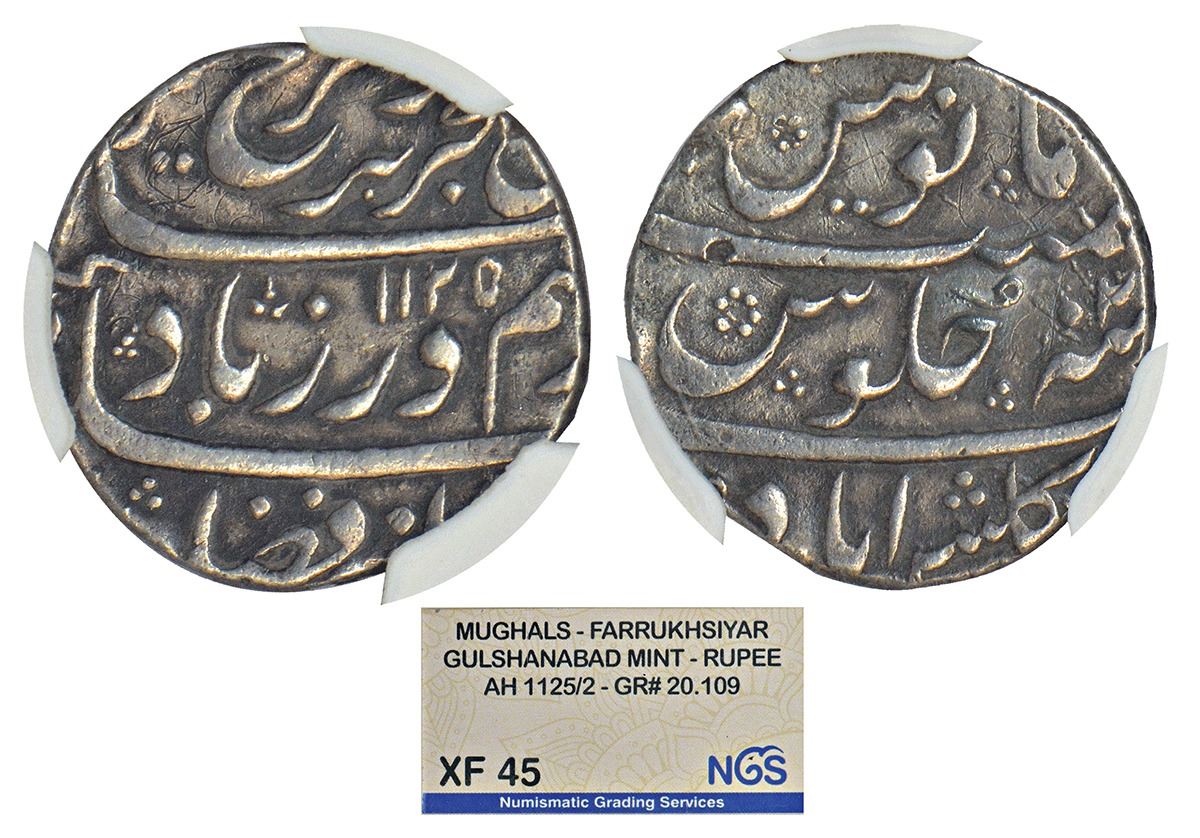 Farrukhsiyar (1713-1719 AD), silver rupee, Gulshanabad (Nashik) mint, 'Bahr-o-Bar' couplet, AH 1125/RY 2, KM 377.28.