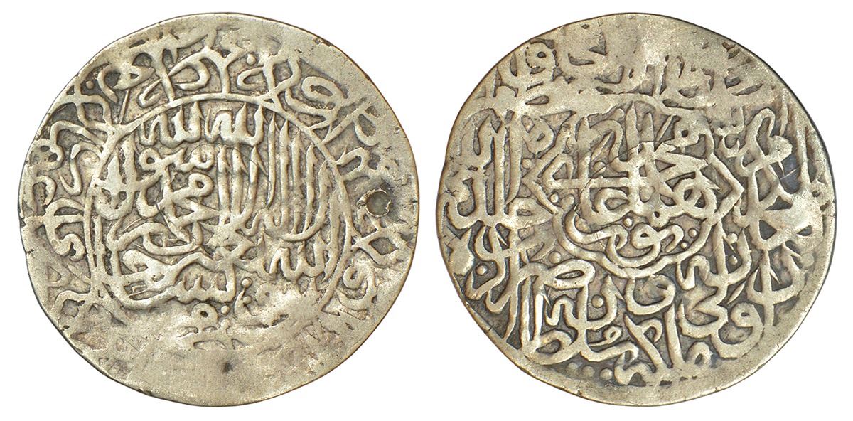Mughals: Humayun (1st reign, 1530-1540 AD) - silver shahrukhi, Agra mint, AH (9)45, 4.65g. Obv: Shahada and invocation Yarzaqu Allah Man Yashao ba-Ghayr Hisab in circle; names of Rashidoons and their titles around. Rev: Legend Muhammad Humayun Ghazi in a mihrab-shaped cartouche; other titles and mint-name in margin.