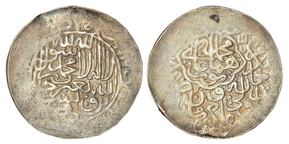 Mughals: Humayun (1st reign, 1530-1540 AD) - silver shahrukhi, Agra mint, date not visible, 4.62g. Obv: Shahada and invocation Yarzaqu Allah Man Yashao ba-Ghayr Hisab in circle; names of Rashidoons and their titles around. Rev: legend Muhammad Humayun Ghazi in a mihrab-shaped cartouche; other titles and mint-name in margin.