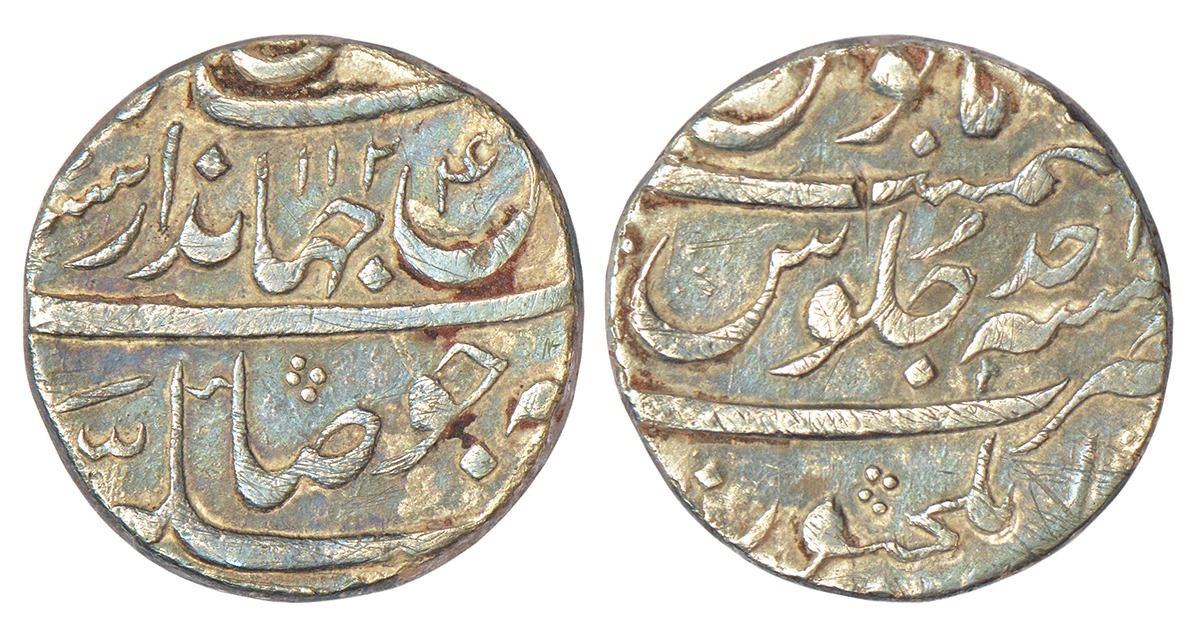 Mughals: Jahandar Shah (1712-1713 AD), silver rupee, Elichpur mint (fully visible), 'Sahib Qiran' couplet, AH 1124/RY Ahd, unlisted in KM, 11.18g. Obv: Persian legend (ba zad) sikka meh chu sahib qiran jahandar shah (badshahe jahan) with AH date. Rev: Mint-name, RY and Jalus formula.