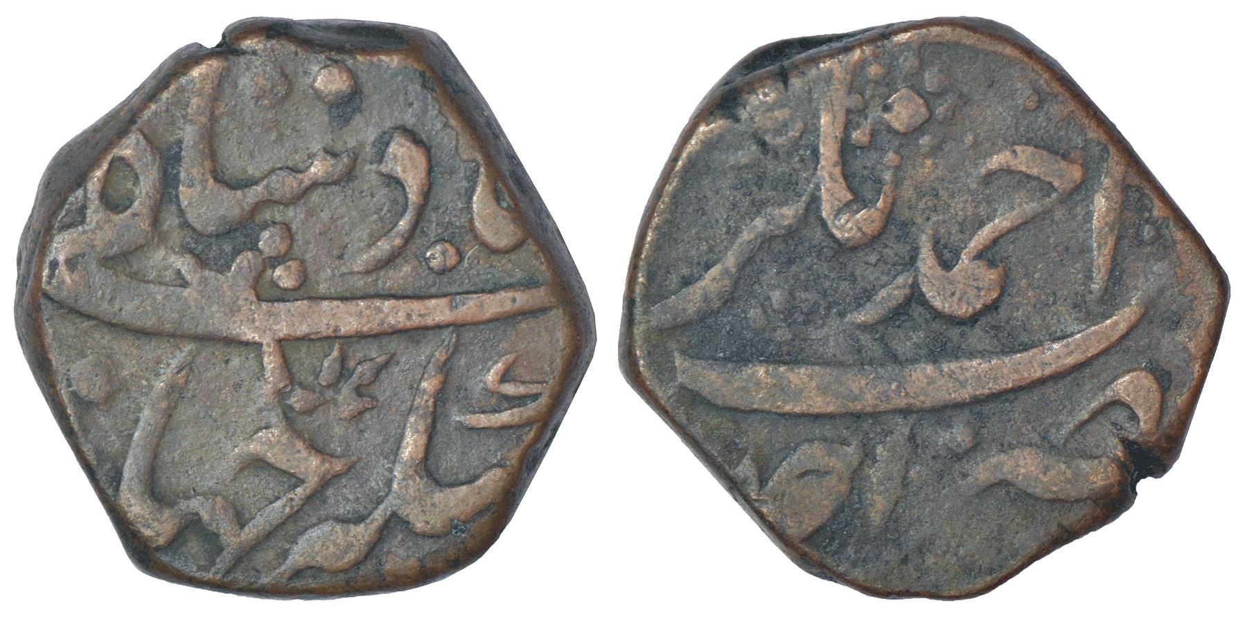 Jahandar Shah (1712-1713 AD), light-weight copper dam, Ahmadnagar (fully visible) mint at top, RY Ahd, not listed in KM, 13.54g. Obv: Legend Sikka jaha….badshah. Rev: Zarb Ahmadnagar and RY Ahd.