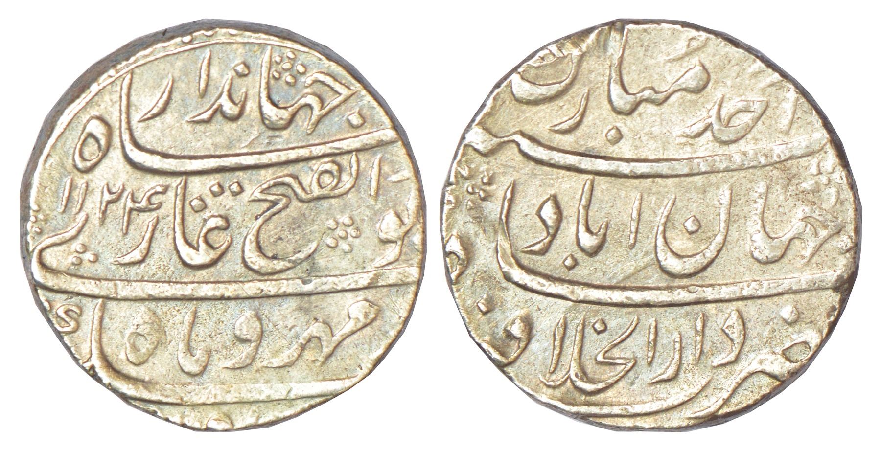 Jahandar Shah (1712-1713 AD), silver rupee, Dar ul-Khilafat Shahjahanabad mint, 'Abu al-Fath' couplet, AH 1124/RY Ahd, 'mubarak' at top on reverse, KM 363.21, 11.40g.