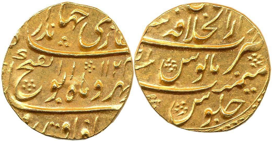 Jahandar Shah, Gold Mohur, 10.93g, “Abu al Fatah” type, Dar ul Khilafat Shahjahanabad Mint, AH 1124/ RY Ahad (KM# 368.6). Extremely fine, rare.