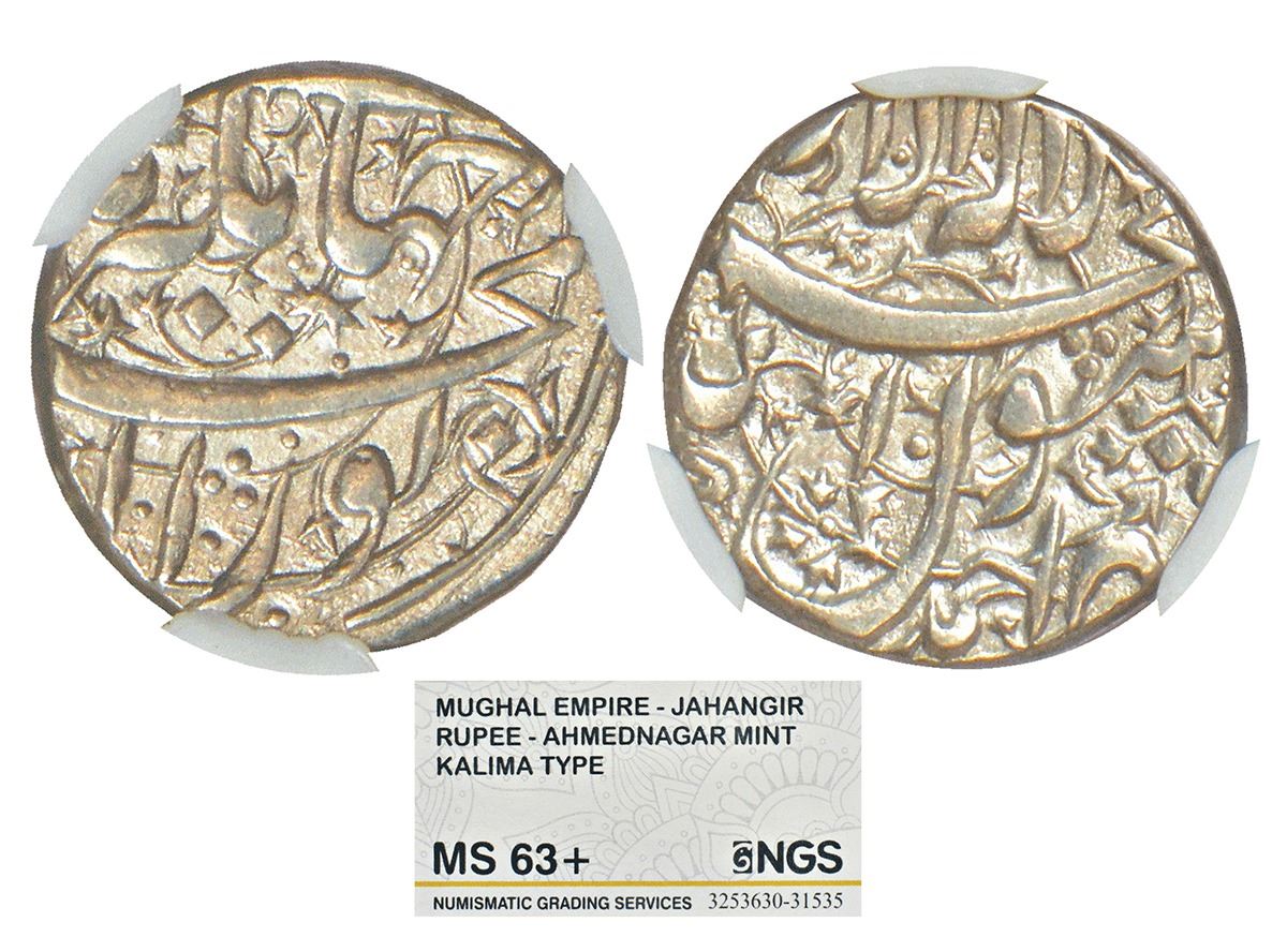 Mughals: Jahangir (1605-1627 AD), silver rupee, Ahmadnagar mint, 'Nur-ud-din' type, KM 141.1.