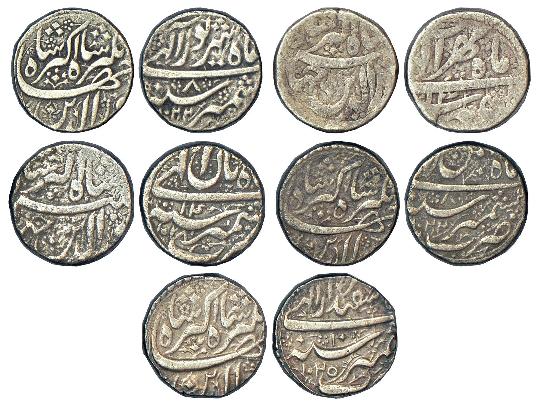 Jahangir (1605-1627 AD), silver rupee, 5 different months, Kashmir mint, Shahrewar, AH 1022/RY 8, 11.28g, Mihr, RY 13, 11.26g, Aban, AH 1028/RY 14, Bahman, AH 1022/RY 8, 11.29g and Isfandarmunz, AH 1025/RY 10, 11.40g, KM 145.10. (5 different months).