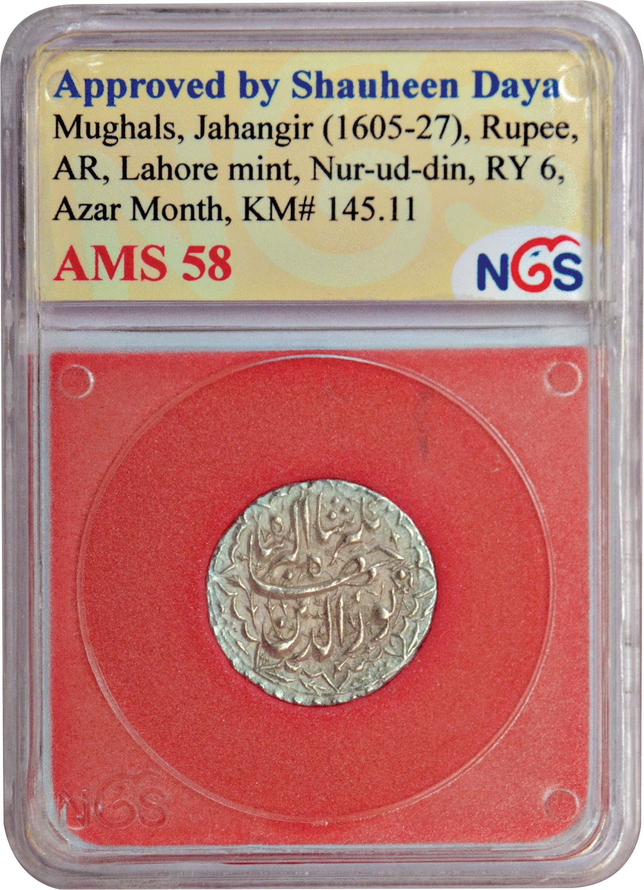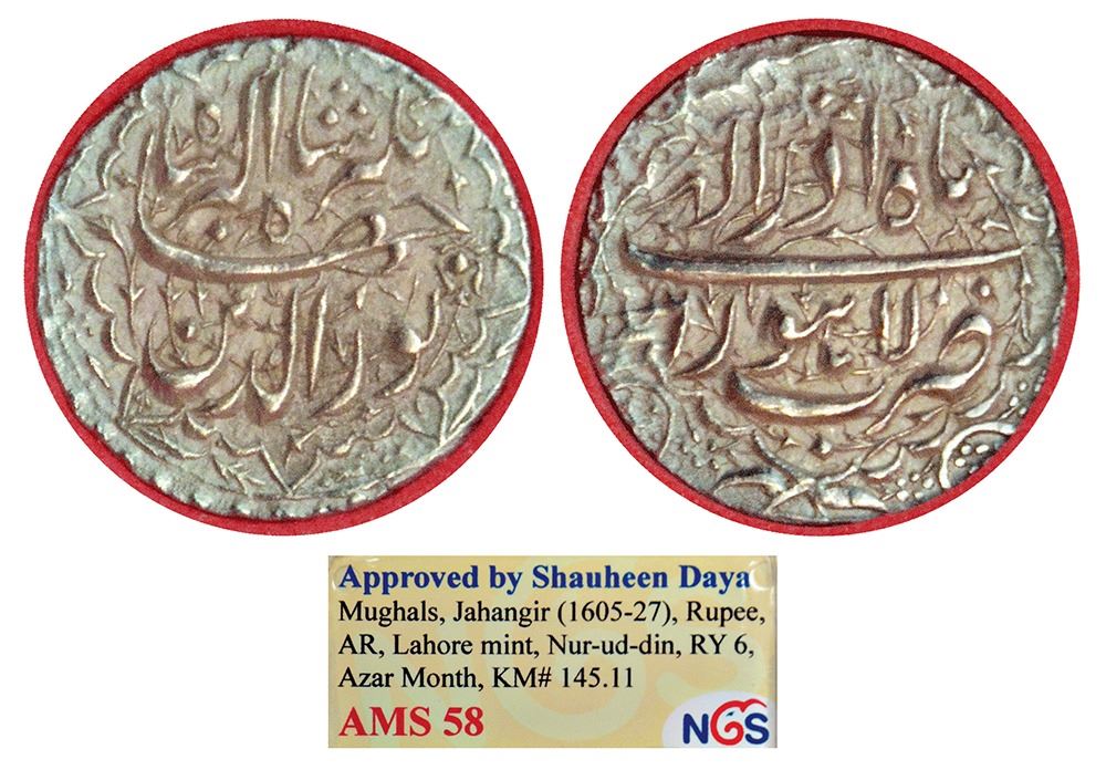Jahangir (1605-1627 AD), silver rupee, Lahore mint, Azar 6, 'Nur ud-Din' type, KM 145.11.