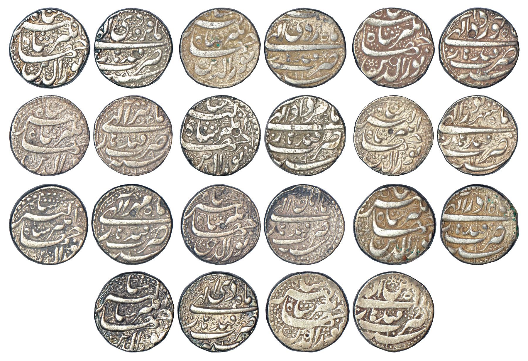 Jahangir (1605-1627 AD), silver rupee, 11 different months, 'Nur ud-Din' type, Qandhar mint, Farwardin-8, 11.07g, Ardibihist-11, 11.36g, Khurdad-11, 11.45g, Tir-9, 10.77g, Amardad-9, 11.18g, Shahrewar-11, 11.44g, Mihr-10, 11.38g, Aban-10, 11.36g, Azar-9, 11.40g, Bahman-10, 10.45g and Di-10, 11.36g, KM 145.13. (11 different months)