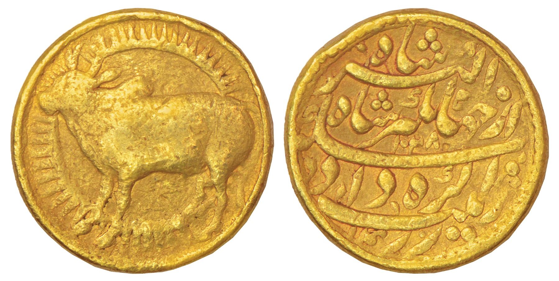 Jahangir (1605-1627 AD), gold zodiacal mohur, Agra mint, 'Taurus' sign, AH 1028/RY 14, KM 180.4, 10.71g. Obv: Bull standing facing left against a sun-burst backdrop. Rev: Farsi couplet Zar Zeenat Dad Sikka-i Agrah/az Jahangir Shah Akbar Shah (“the stamp of Agra gave beauty to gold, by king Jahangir (the son of) king Akbar”).