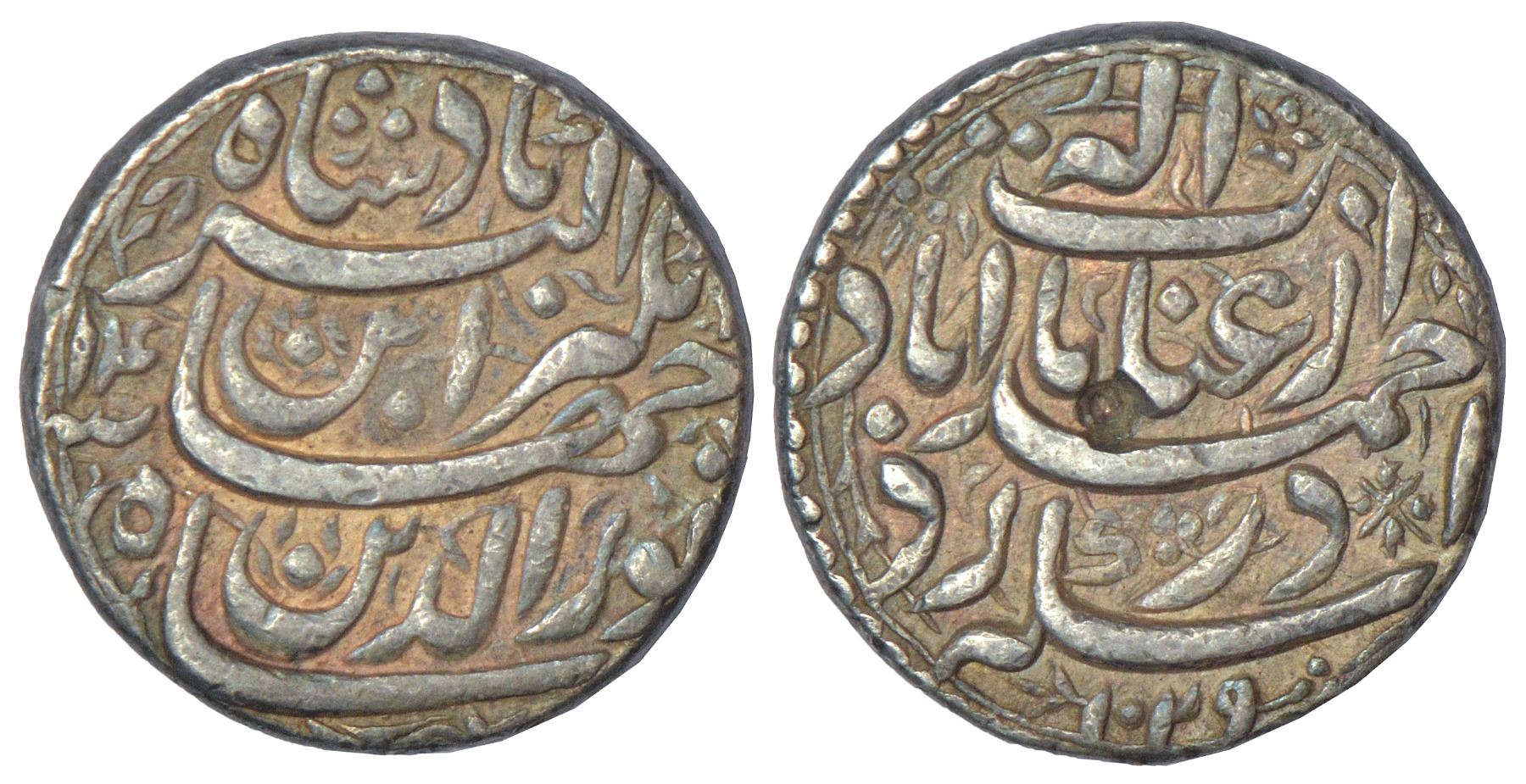 Mughals: Jahangir, silver rupee, Ahmadabad mint, Inayat couplet, AH 1029/RY 14, KM 149.4, 11.37g.