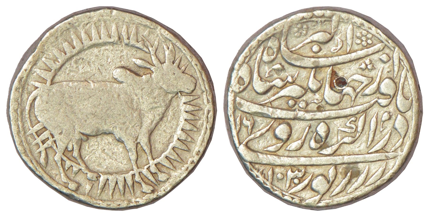 Jahangir (1605-1627 AD), silver zodiacal rupee, Agra mint, 'Taurus' sign, AH1030/RY16, 11.35g. Obv: Bull standing facing right against a sun-burst backdrop. Rev: Farsi couplet Ruy-i Zar za Noor Yaft dar Agrah/az Jahangir Shah Akbar Shah (“the face of gold was given light in Agra, by king Jahangir (the son of) king Akbar”).