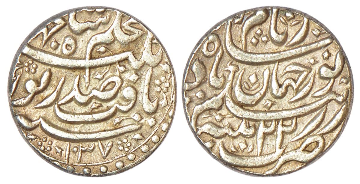 Jahangir with the name of Noor Jahan (1623-1627 AD), silver rupee, Patna mint (fully visible), 'Sad Zewar' couplet, 1037/RY 22, KM 168.5, 11.38g. Obv: Farsi hemistich ba-hukm-i shah jahangir yaft sad zewar with AH date. Rev: Farsi hemistich za naame noorjahan badshah begam zar; zarb patna and RY.