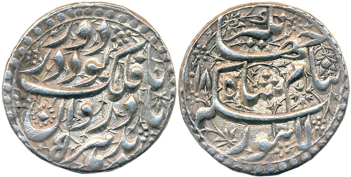 Jahangir, Silver Sawai Heavy Rupee, 14.24g, “Ta Falk” couplet, Lahore Mint, AH 1018/ RY 5, Obv: “Badhar bad rawaan ta falak, buwad dar daur” (In the world so long the heavens revolve may current), Rev: “Ba name shahe Jahangir, sikka- e- Lahor” (be in the name of Shah Jahangir, the money of Lahore), both sides legend within dotted border (KM# 158.5). Extremely fine, extremely rare in such high grade.