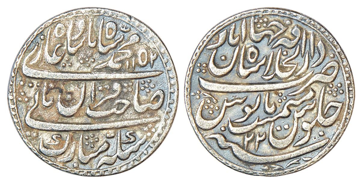 Muhammad Shah (1719-1748 AD), silver nazarana rupee, Dar ul-Khilafat Shahjahanabad mint, 'Sahib Qiran' type, AH 1152/RY 22, KM B438.2 (listed as nazarana), 27.97mm, 10.78g. Obv: Persian legend sikka mubarak sahib-e-qiran sani muhammad shah badshah ghazi with AH date. Rev: Mint-name with epithet, RY and Jalus Maimanat Manus.