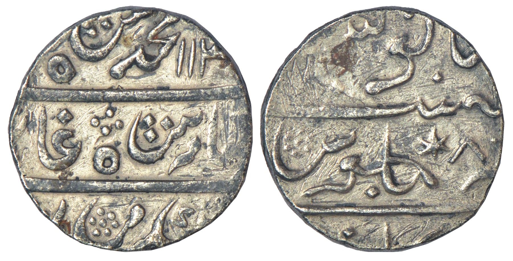 The 'Arkat' rupees in the name of Muhammad Shah were struck at many places throughout peninsular India and by many authorities, including Nawabs of Arcot, the Marathas and various European trading companies. This variety with 'star' similar to the mark of the British mint of Chinapattan is one of the rarest of these varieties.