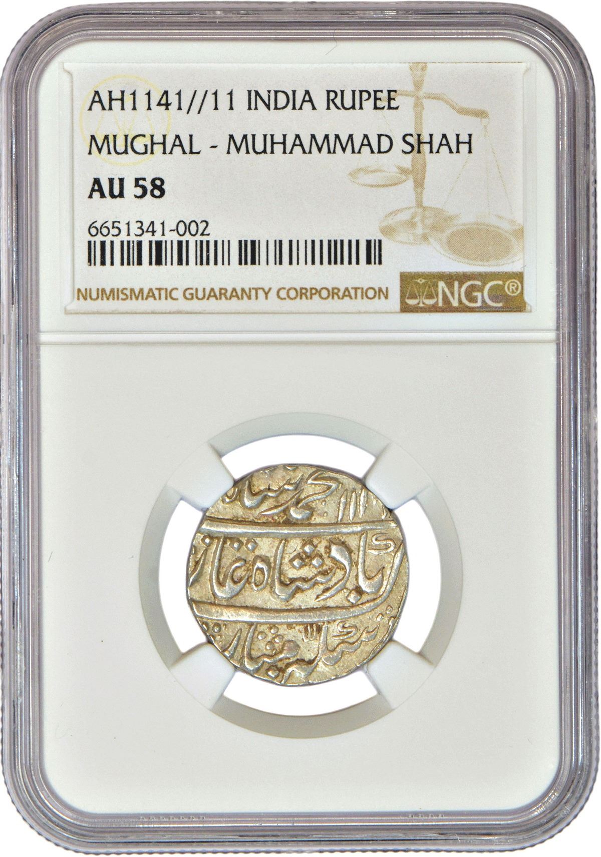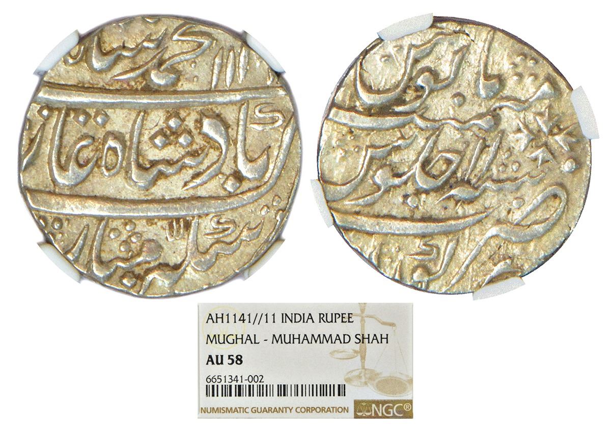 Muhammad Shah (1719-1748 AD), silver rupee, Kora mint, AH 1141/RY 11, KM 436.39.