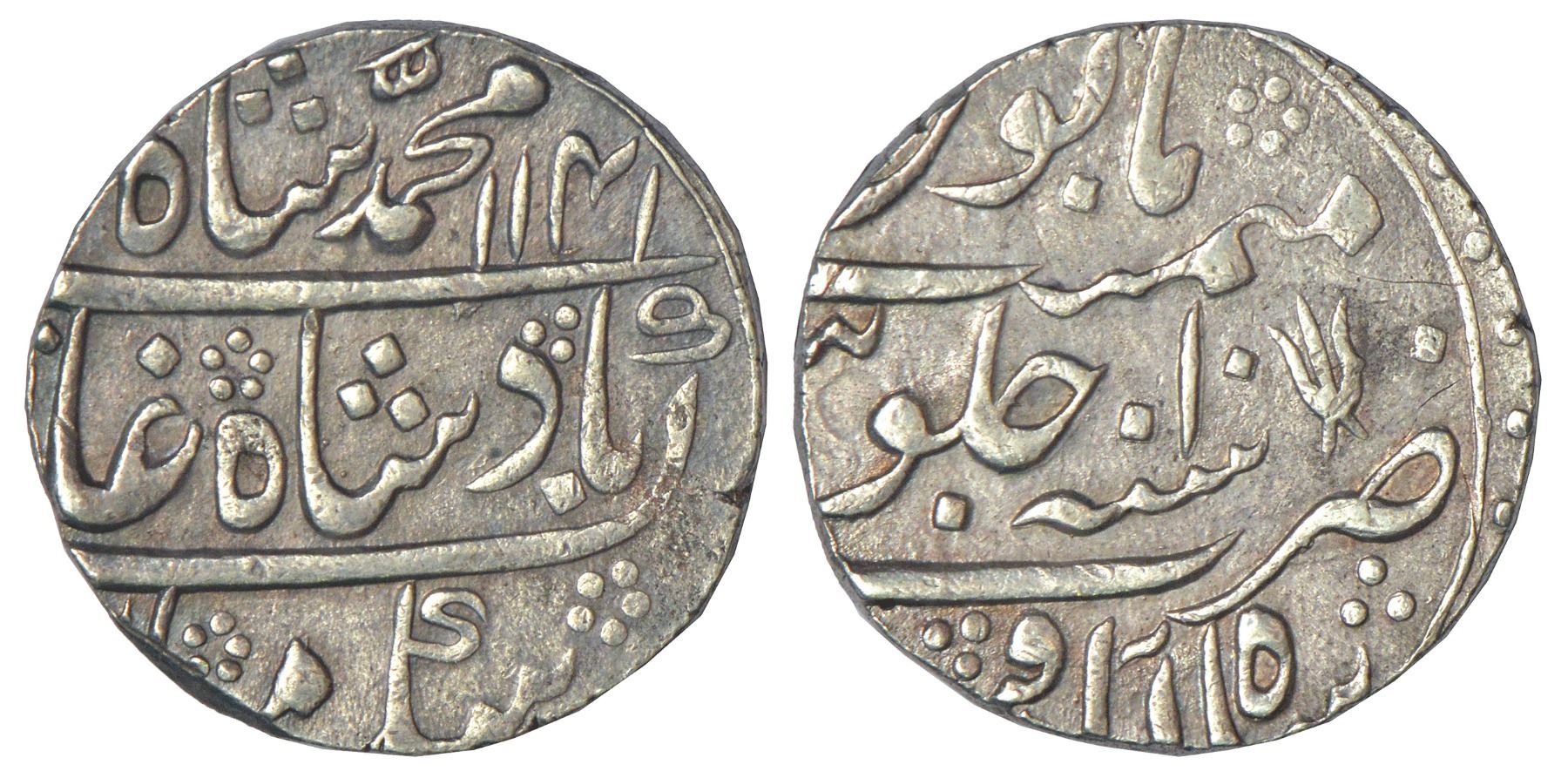 Muhammad Shah (1719-1748 AD), silver rupee, Shahabad Qanauj mint, AH 1141/RY 10, Trisul mintmark near to sanah on reverse, KM 436.52, 11.35g.