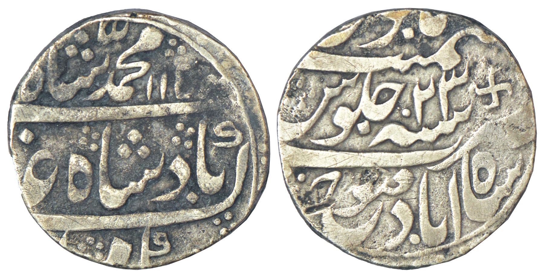 Muhammad Shah (1719-1748 AD), silver rupee, Shahabad Qanauj mint, AH 1154/RY 23, swastika mintmark near to sanah on reverse, KM 436.52, 10.90g.