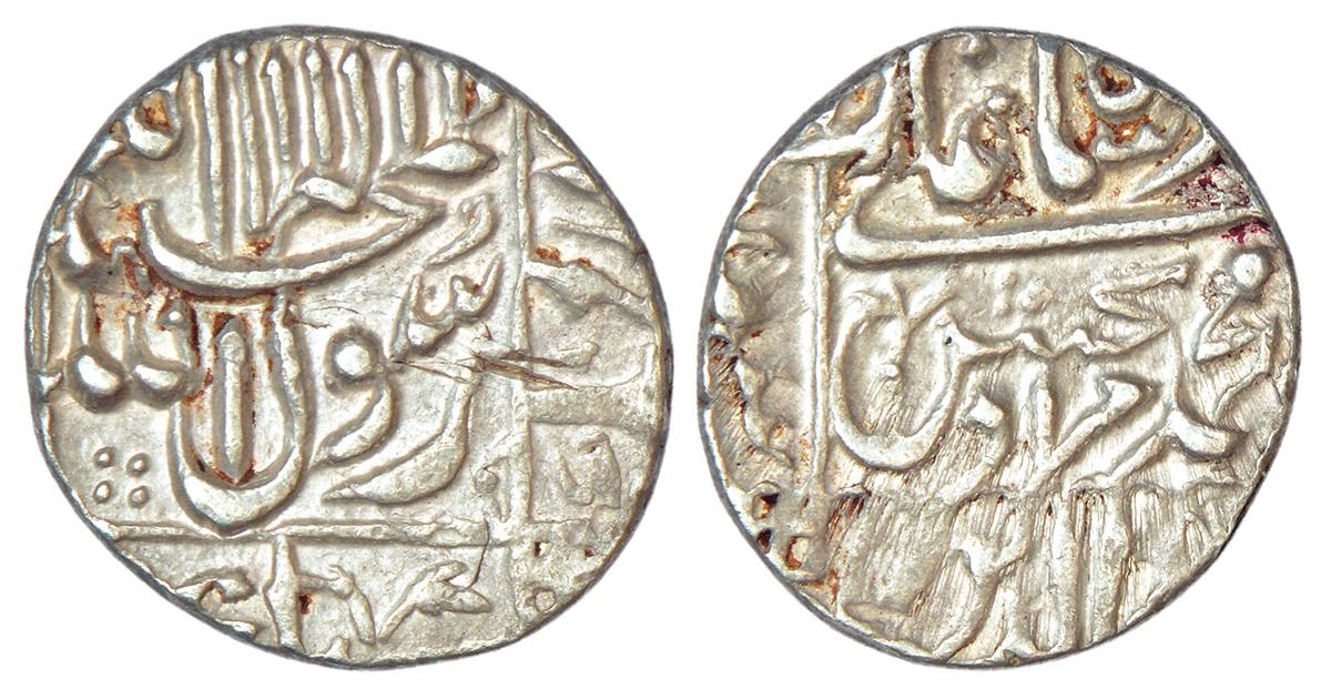 Murad Bakhsh (1658 AD), silver ½ rupee, Surat mint in left quadrant, 'square areas' type, KM 270.2, 5.72g.