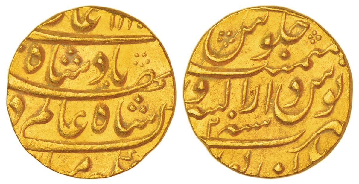 Shah Alam Bahadur (1707-1712 AD), gold mohur, Dar us-Sarur Burhanpur mint, AH 1120/RY 2, KM 356.3, 10.91g. Obv: Persian legend sikka mubarak shah alam bahadur badshah ghazi with AH date. Rev: Mint-name with epithet, RY and Jalus formula.