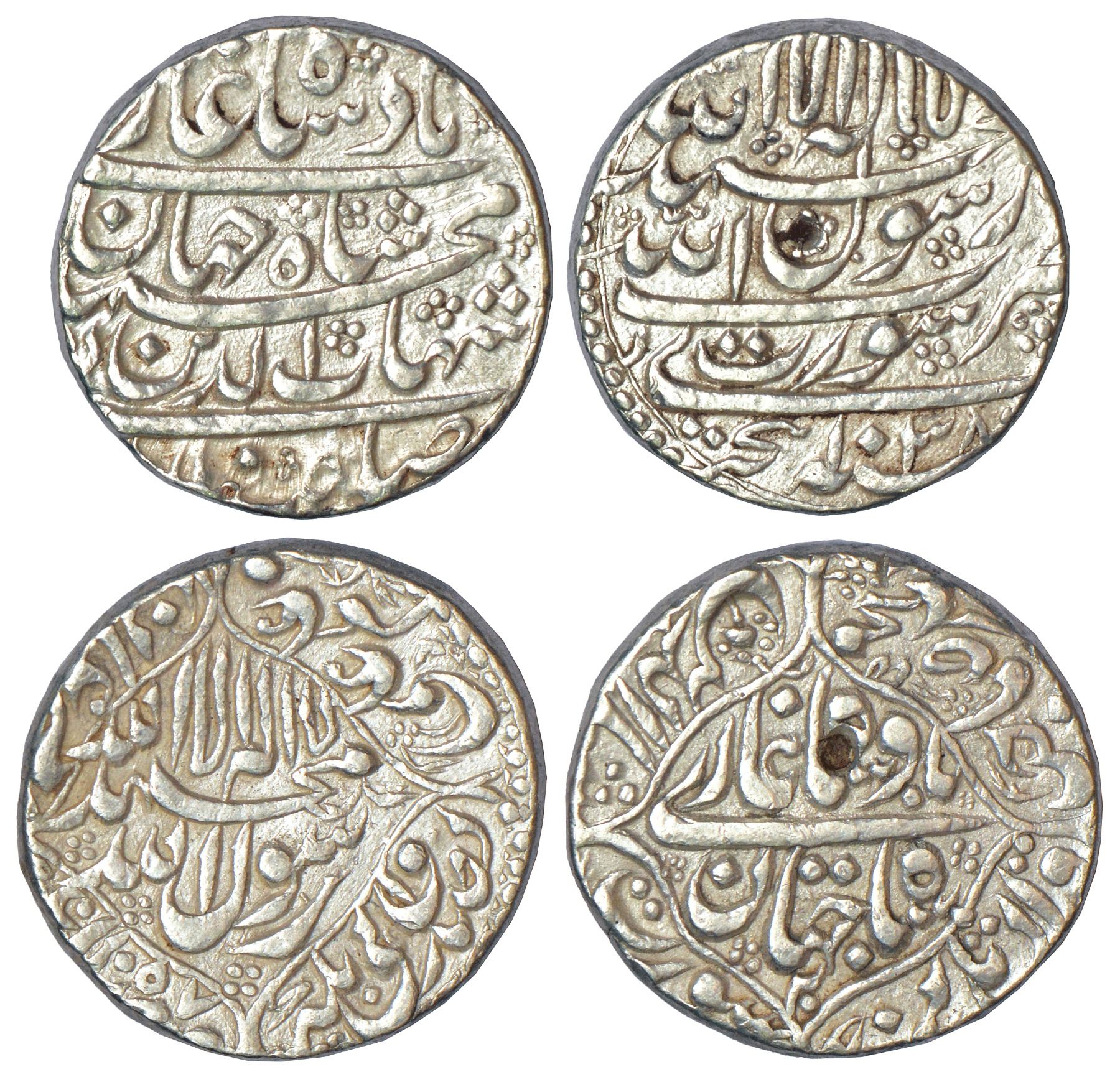 Shah Jahan (1628-1658 AD), silver rupee (2), Surat mint, AH 1038, KM 222.13, 11.40g and AH 1057/RY 20, KM 230.3, 11.48g. (2 different types)