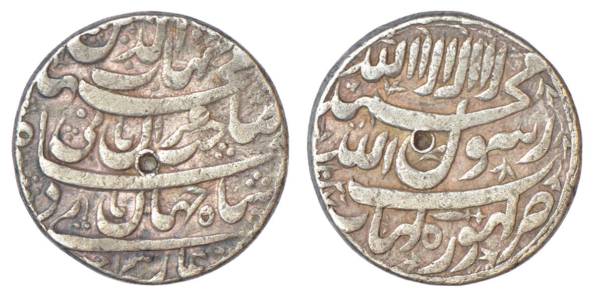 Mughals: Shah Jahan (1628-1658 AD), silver rupee, Ghoraghat mint (fully visible), AH 1037/RY Ahd, sword symbol on reverse, unusual placement of AH date at 8'o clock on reverse, Zeno #143382, KM 222.20, 11.29g. Obv: Emperor's full name and title sahib-e-qiran sani shihab ud-din muhammad shahjahan badshah ghazi with RY in four lines. Rev: The Kalima Shahada with mint-name and AH date.