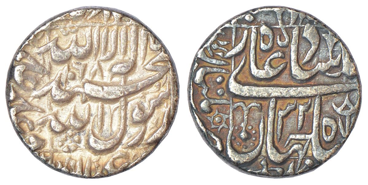Shah Jahan (1628-1658 AD), silver rupee, Multan mint in left quadrant, 'square areas' type, AH 1068/RY 32, struck during the last year of the emperor, sun and flower symbols on reverse, KM 235.19, 11.37g.