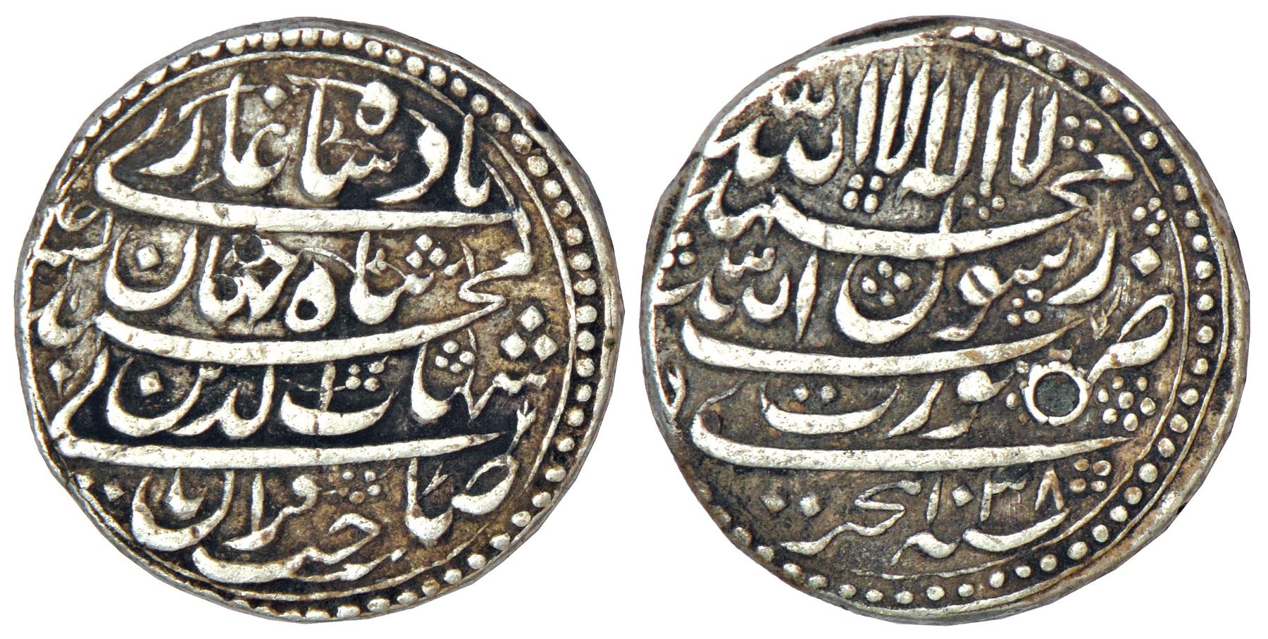 Shah Jahan (1628-1658 AD), silver rupee, Surat mint, AH 1038/RY Ahd, with emperor's full name and title, KM 222.13.