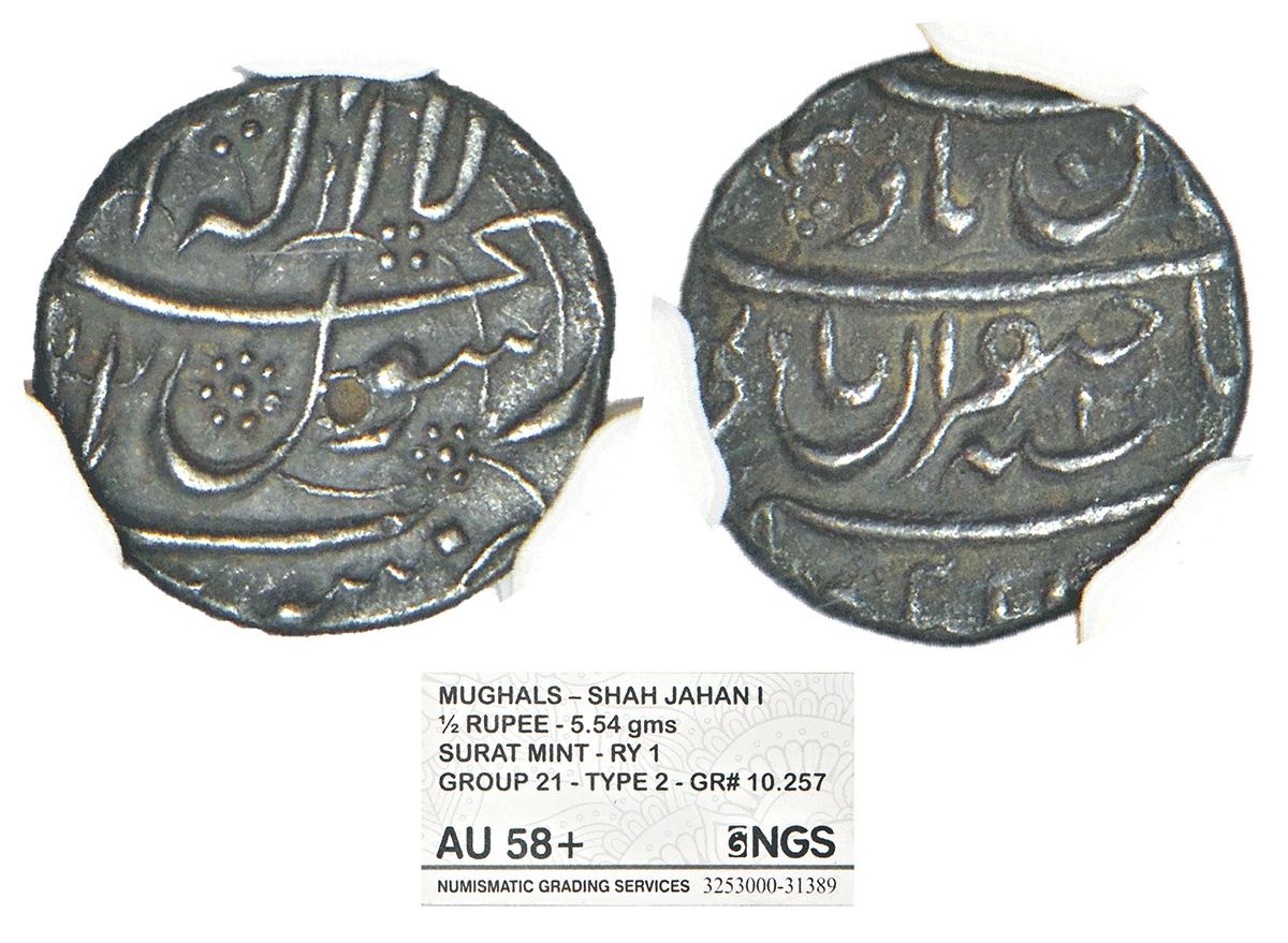 Mughals: Shah Jahan (1628-1658 AD), silver ½ rupee, Surat mint, 'Sahib Qiran' type, 5.69g.