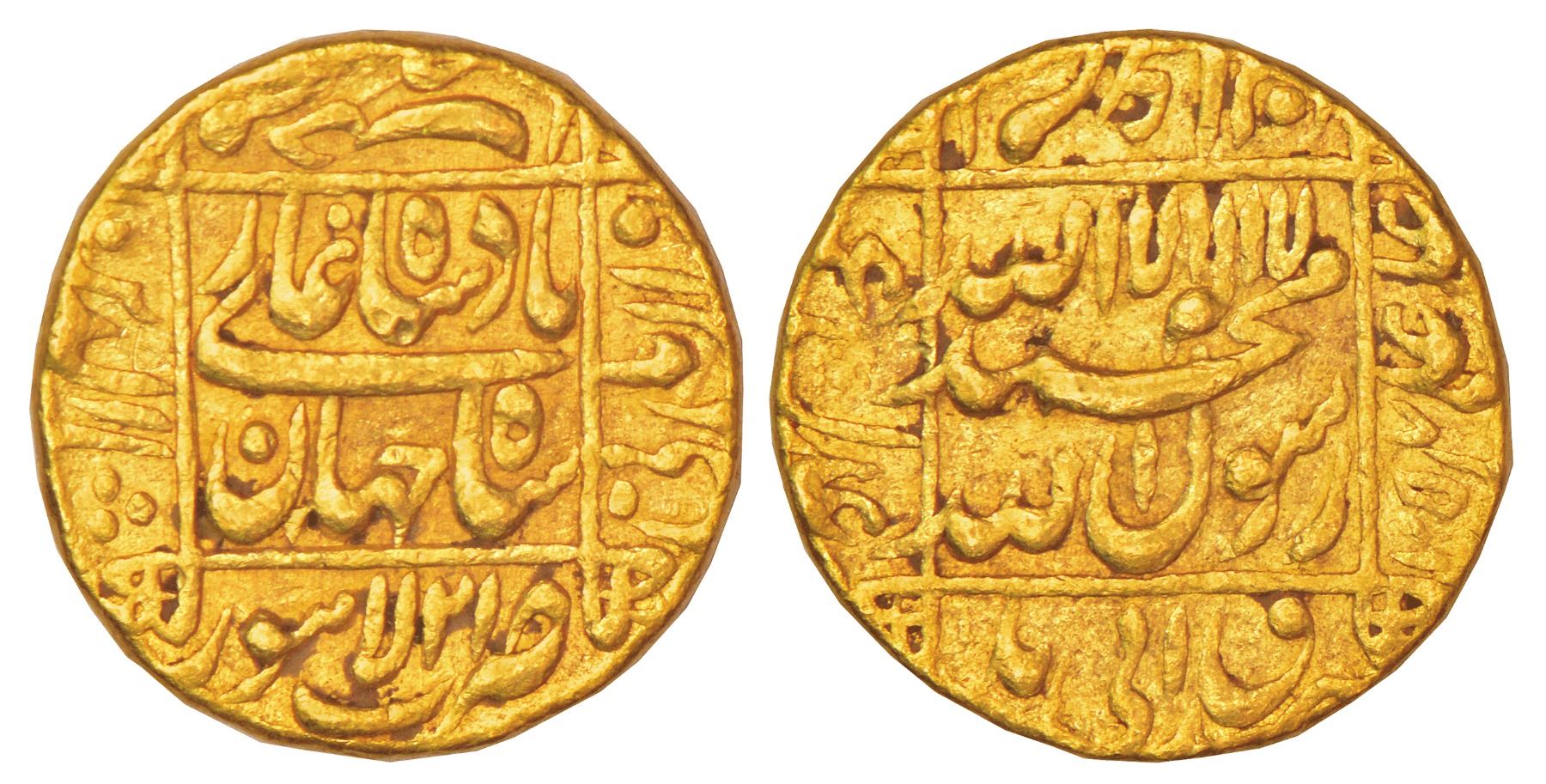 Shah Jahan (1628-1658 AD), gold mohur, Lahore mint (fully visible), AH 1057/RY 21, KM 260.11, 10.87g.