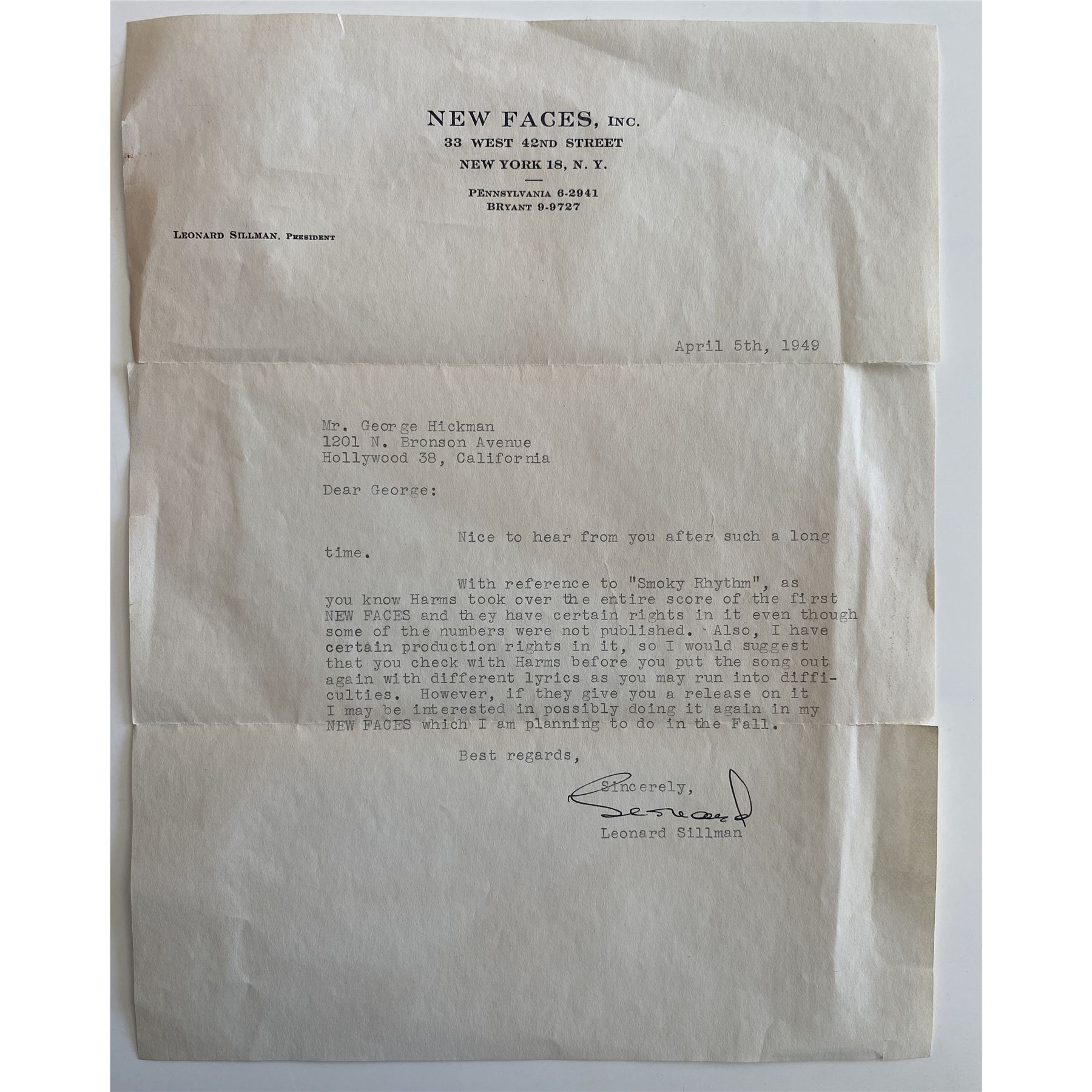Music producer Leonard Sillman 1949 signed letter. 9x11 inches