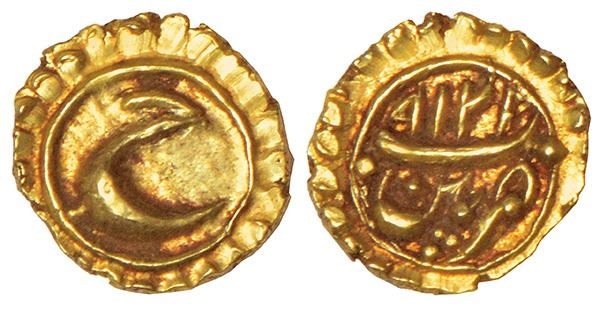 Mysore, Tipu Sultan (1782-1799 AD), gold fanam, Pattan mint, AM 1219, Persian 'He' on obverse, KM 128.1, 0.39g.