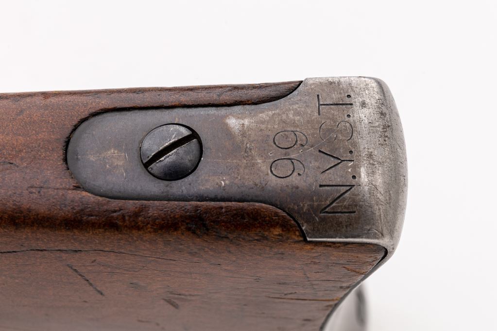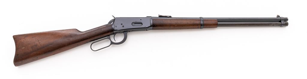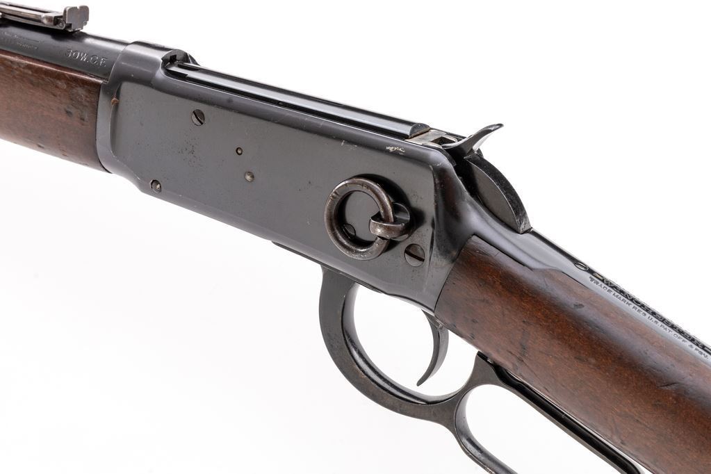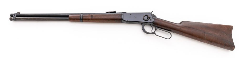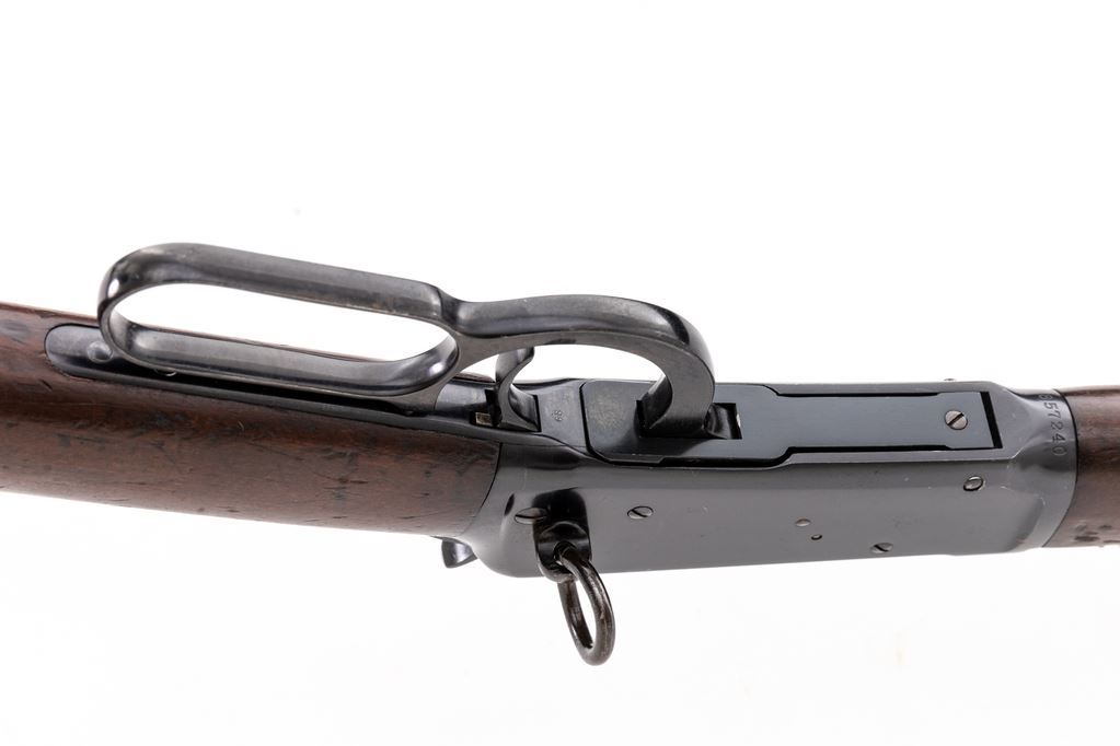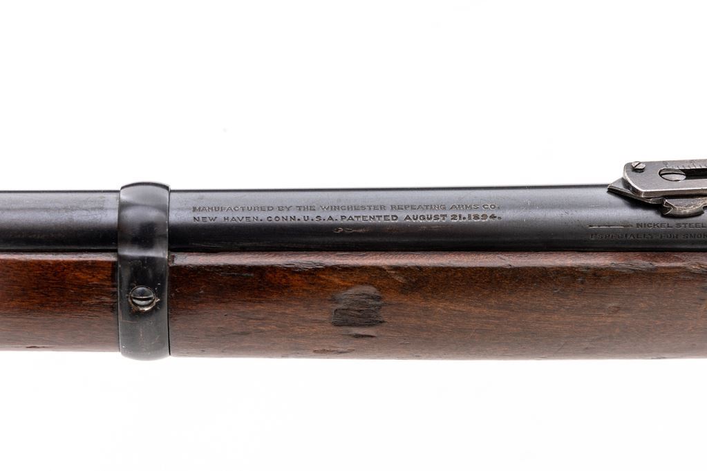"N.Y.S.T."-Marked Winchester Model 1894 Lever Action Carbine, #857240, .30 W.C.F. (.30-30) cal., 20" round barrel marked with maker's name, address and 1894 patent date, "Nickel Steel Barrel/Especially for Smokeless Powder" and caliber at left; receiver has right loading, top ejection, bottom loop operating lever, is marked "Model 1894/Winchester" and trade mark-pat. off. data on top tang; walnut forend has a single band, matching buttstock (marked "8") with carbine buttplate (marked "99/N.Y.S.T." at top screw). Mfg'd. 1919. Condition is fine retaining approx. 85% thinning barrel blue, 50% mag tube blue, 95% receiver, hammer, and lever blue; traces of blue on buttplate but mostly gunmetal gray. Stocks are sound and smooth with general use marks, dings, a half-inch gouge at left forend and most oil finish. Edges and markings are sharp, action is crisp, bore is bright showing light frosting and sharp rifling. Stampings may mean "New York State Trooper #99, Barracks 8." Est.: $1,200-$1,800. (C&R)