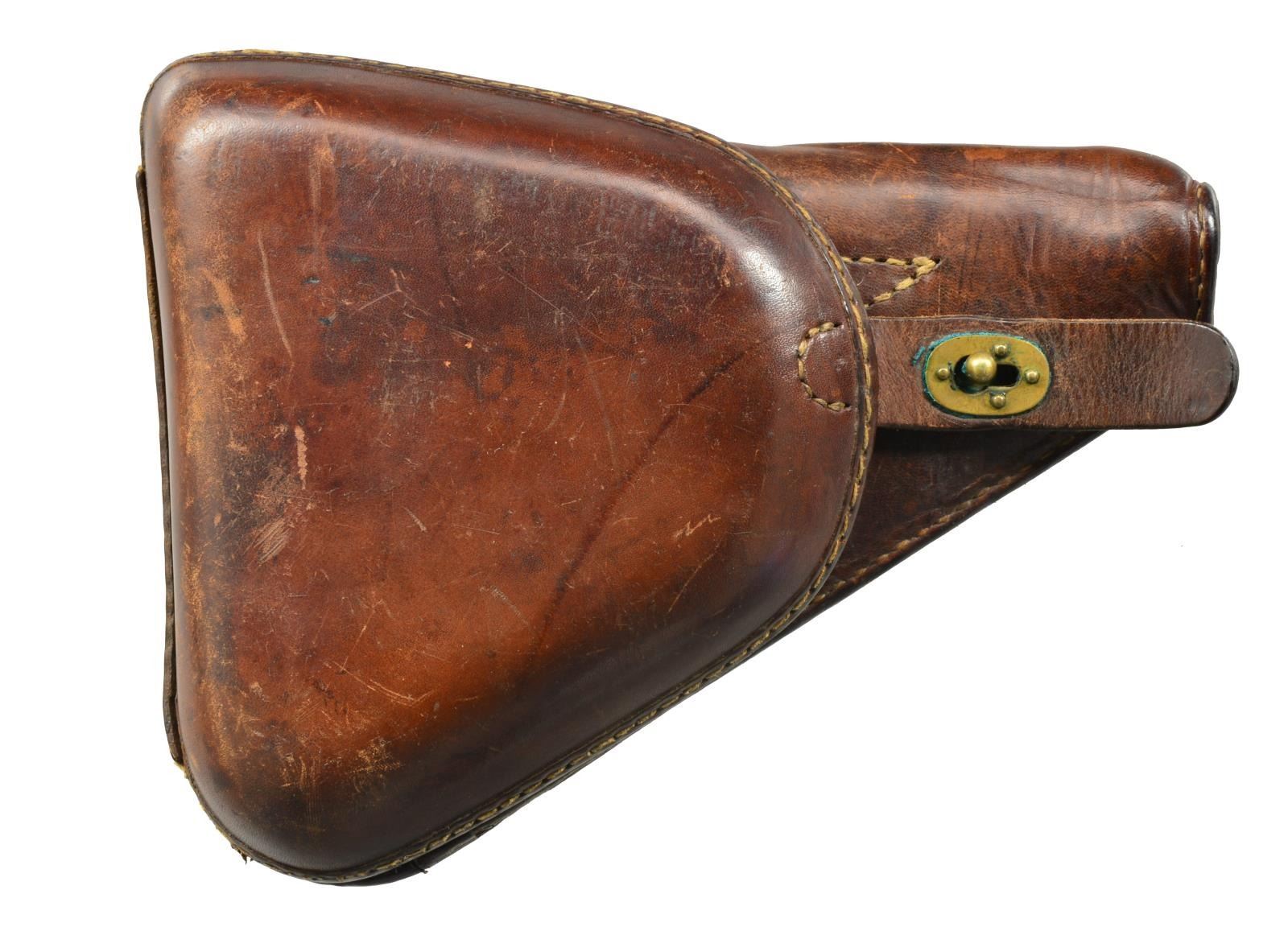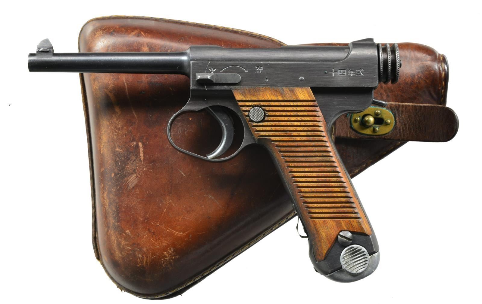 Cal. 8mm Nambu. S# 94411. Bbl. 4.7". Mfg. Oct. 1943 w/ lg. trigger guard & 24 groove hardwood grips. 2 Groove knurled cocking piece. All blued including sm. parts. Matching numbers on cocking piece, bolt & trigger. MAGS: 1 good plus lightly worn blued 8 rd. w/ aluminum base. Correct serrated thumb piece; #478. UNATTACHED ACCESSORIES: good leather clamshell holster. Single wide belt loop & 2 square brass rings for shoulder strap. Markings under cover plus remnants of white sticker w/ Japanese characters. Cleaning rod included. Brass studs & grommet. CONDITION: typical safety mark on receiver. All other exterior aspects near excellent. Near excellent bore. (20-2159/NW). CURIO. $700-1,000.