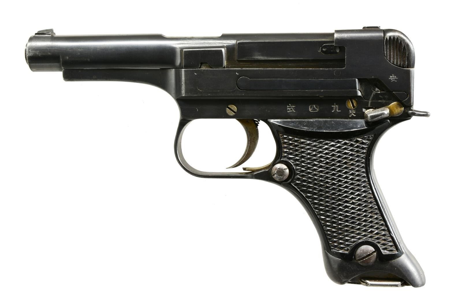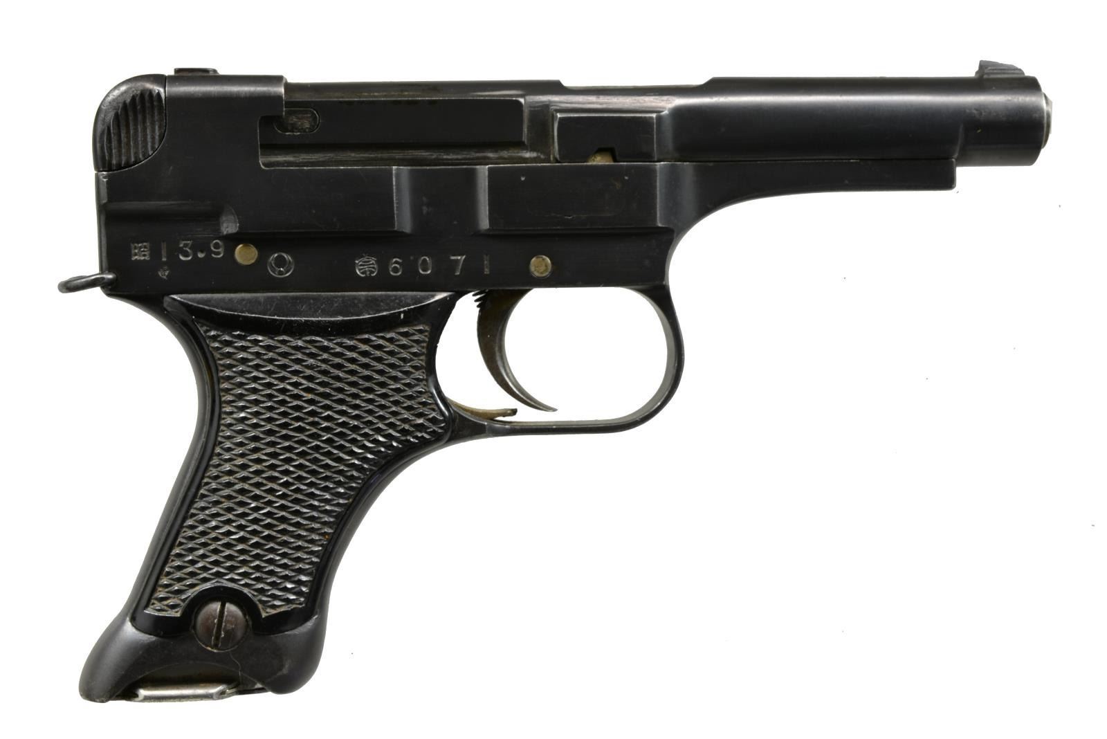 Cal. 8mm Nambu. S# 6071. Bbl. 3.8". Mfg. September 1938 at Nagoya Arsenal. Approx. 70,000 mfg. 1935-1945 as secondary service pistol. Checkered black bakelite grips. MAGS: 1 very good matching numbered 6 rd. w/ some spotty finish loss on front of floor plate & top of spine. CONDITION: good to very good overall appearance w/ peppery oxidation in grip area & scattered peppery oxidation spots throughout. Fair to good bore w/ wear & light pitting. (20-1484/NW). CURIO. $500-800.