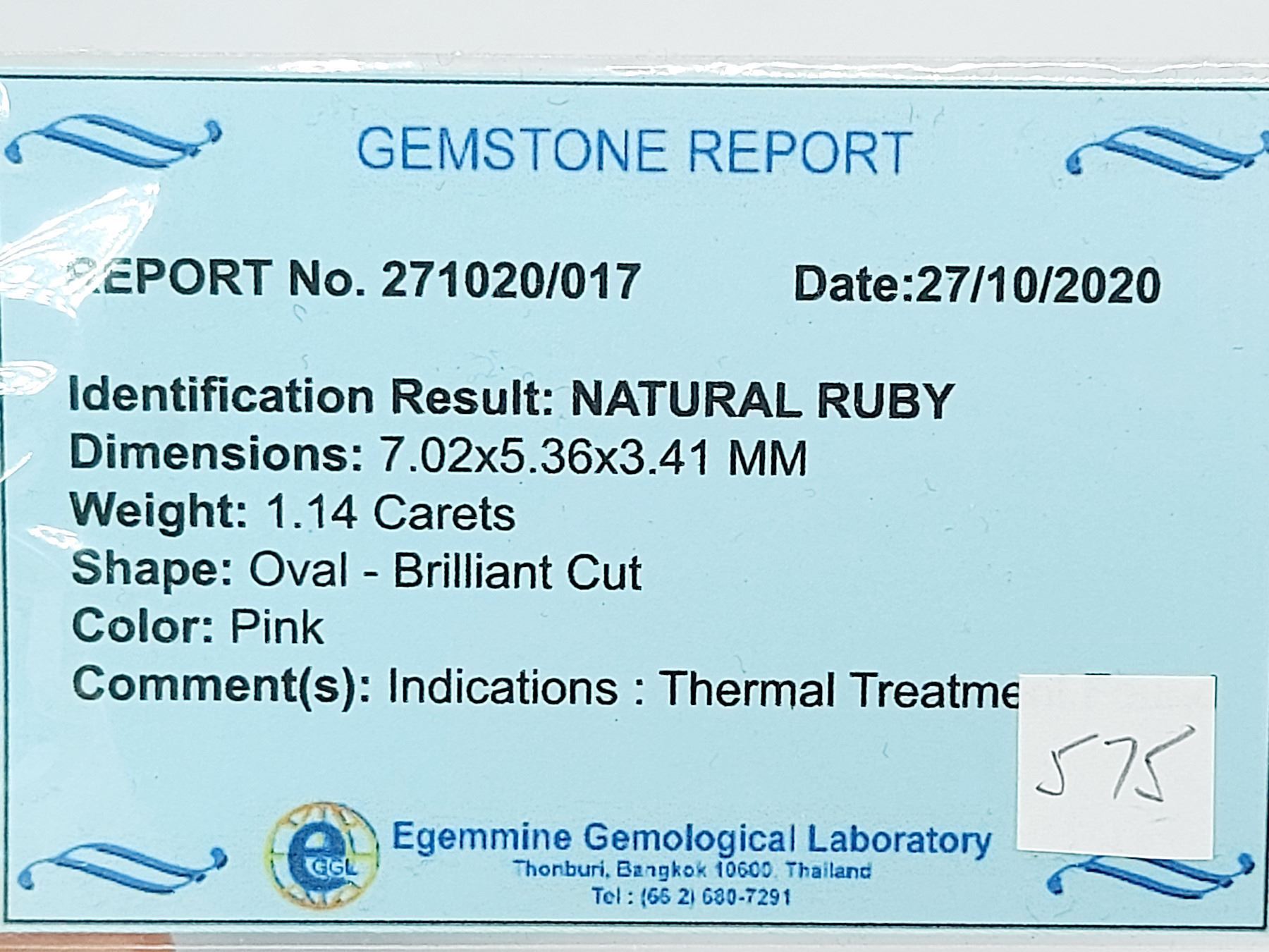 0.635 ct. 6.12 x 4.23 x 2.71 mm Colour: Pinkish Red , Shape: Oval Cut , Clarity: VVS - Eye Clean , Luster: Exceptional , Heated