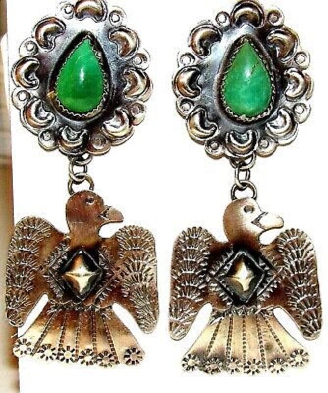 Fab Navajo sterling silver and green Royston turquoise thunderbird statement earrings by a collectible Navajo artist Tim Yazzie. Detailed hand stamped design, beautiful green Royston turquoise oval stones. Hand stamped and repousse design. Unsigned, tested, comes direct from the artist. The earrings wear comfortably. Measure impressive 2 3/4" long by a little over 1" wide. Post style pierced dangle statement earrings. Wonderful examples of wearable Native art.
